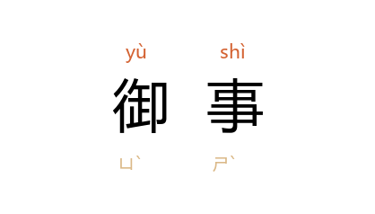 引《书·顾命》:“乃同召太保 奭、芮伯、彤伯、毕公、卫侯、毛公 、师氏、虎臣、百尹、御事。”孔 传:“诸御治事者。”孙星衍 疏:“主事者。”《国语·周语上》:“百官御事,各即其斋三日。”《汉书·翟方进传》:“肆予告我诸侯王公列侯卿大夫元士御事。”郭沫若 《中国古代社会研究》第三篇第一章第二节:“一般的庶邦君和庶士御事者都反对,说很困难,民还不安定。”