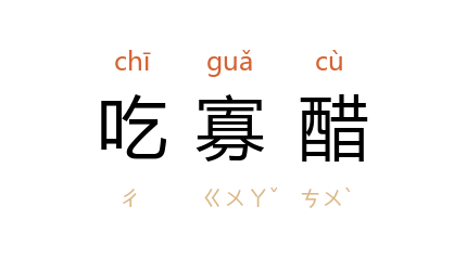 引元 无名氏 《百花亭》第二折:“我几曾调他来,皆是他心上自爱上我,你吃这等寡醋做甚么?”《二十年目睹之怪现状》第四九回:“无端的在这里吃寡醋,説这一席是我吃的,怕他知道,却屈你坐了主位,遮他耳目,你説奇不奇?”