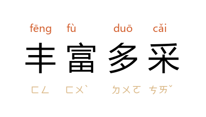 引林默涵 《<53-55年短篇小说选>序言》:“一个壮丽宏伟、丰富多采的生活图景,正在我们面前展开。”秦牧 《艺海拾贝·<果王>的美号》:“而在具体主题、内容、体裁、手法上,却完全可以是丰富多采的。”