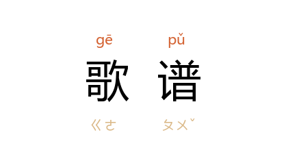 ⒈ 歌曲的谱子。通常以全音符、二分音符、四分音符等置于五线谱上,以表现曲调,或以1、2……7 等数目以表示音阶高低而写成简谱。