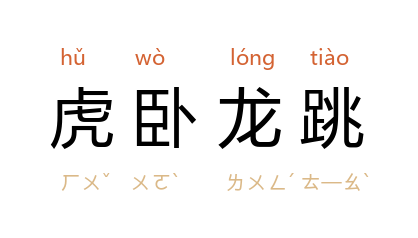 引语出 南朝 梁 袁昂 《评书》:“王右军 书,字势雄强,如龙跳天门,虎卧凤阁,故歷代寳之,永以为训。”《儿女英雄传》第三六回:“安公子 经 安老爷 这几个月的造就工夫,那本殿试卷子真真作得来经经纬史,写得来虎卧龙跳,钦派閲卷大臣把他优定在前十本以内。”