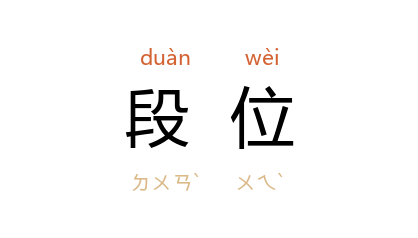⒈  表明围棋棋手棋艺高低的等级。段位共分九个等级,最高为九段,最低为初段。棋手通过比赛进入初段,入段后则可以参加升段比赛,根据棋手们的不同程度,叙定“段”的位次。