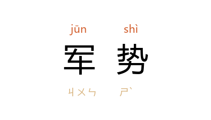 引《三国志·魏志·王朗传》:“孝武 之所以能奋其军势,拓其外境,诚因祖考畜积素足,故能遂成大功。”《新唐书·韦表微传》:“以 听 军势,不十五日必破贼。”郭沫若 《李白与杜甫·李白在政治活动中的第二次失败》:“永王 的军势在 丹阳 附近被地方势力击败。”