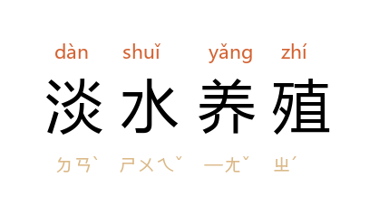 ⒈ 利用天然水面或人工造就的养殖水面,繁殖、饲养鱼类、虾类、蟹类,以及利用河蚌培育珍珠的生产方式。淡水养殖的鱼类主要有青鱼、草鱼、鲢鱼、鳙鱼、鲫鱼、鳜鱼、鳊鱼、鳗鲡等,养殖的虾类有罗氏沼虾、海南大虾等,养殖的蟹类主要是河蟹。