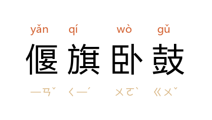 引《梁书·卷四五·王僧辩传》:「及贼前锋次江口,僧辩乃分命众军,乘城固守,偃旗卧鼓,安若无人。」《旧唐书·六九·薛万彻传》:「时梁师都以突厥之师顿于城下,兰偃旗卧鼓,不与之争锋。」