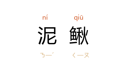 ⒈ 亦作“泥鰍”。鱼名。体圆柱形,尾端侧扁,有黏液。黄褐色,有不规则黑色斑点。口小,嘴有须五对。常生活在河湖、池沼、水田等处,潜伏泥中。肉可供食用。