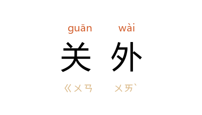 ⒈ 关口以外的地区:(1) 山海关以东、以北的东北地区。(2) 嘉峪关以西的地方。即今甘肃西部及新疆省地区。