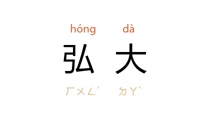 引《诗·大雅·民劳》:“戎虽小子,而式弘大。”郑玄 笺:“弘,广也。”《韩非子·扬权》:“夫道者,弘大而无形。”唐 柳宗元 《与萧翰林俛书》:“圣朝弘大,贬黜甚薄,不能塞众人之怒。”《辽史·太宗纪上》:“召 敬瑭 至行在所,赐坐。上从容语之曰:‘吾三千里举兵而来,一战而胜,殆天意也。观汝雄伟弘大,宜受兹南土,世为我藩辅。’”