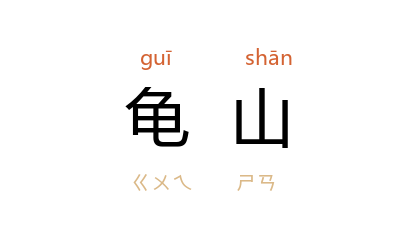 ⒈ 山名:(1) 在大陆地区山东省泗水县东。昔时孔子望山而作琴曲龟山操。(2) 在大陆 地区湖北省汉阳县东北。即大别山,为江汉要塞。(3) 在大陆地区福建省将乐县东北。宋朝杨时归休于此,学者称称为「龟山先生」。(4) 在大陆地区安徽省盱眙县。有 上、下二山,上龟山在县东南,下龟山在县东北。