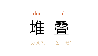 引宋 王灼 《糖霜谱》五:“凡霜,一瓮中品色亦自不同,堆叠如假山者为上,团枝次之。”明 李东阳 《诗话》:“观其所自作,则堆叠餖飣,殊乏兴调。”冰心 《寄小读者》十一:“果点和玩具和书,都堆迭在桌上。”