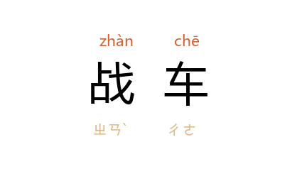 ⒈ 又称兵车。盛行于 春秋、战国。每辆配有一定数量的将士,故往往用战车数量计算兵力。现泛指作战用的车辆。