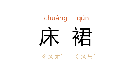 引《宋史·舆服志五》:“凡帐幔、缴壁、承尘、柱衣、额道、项帕、覆旌、牀裙,毋得用纯锦徧绣。”《红楼梦》第十七回:“椅搭、桌围、牀裙、杌套,每分一千二百件,也有了。”