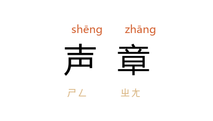 引《国语·晋语一》:“变非声章,弗能移也。声章过数则有衅,有衅则敌入。”韦昭 注:“声,金鼓也;章,旌旗也。”后以喻声势威风。 唐 韩愈 《唐故相权公墓碑》:“维匡调娱,不失其正;中於和节,不为声章。”