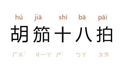 ⒈ 古乐府琴曲歌辞,相传东汉末年蔡邕之女蔡文姬所作,一章为一拍,共十八章,故名。内容写她东汉末年为乱军所掳,落入南匈奴,后被赎归汉,途中想念亲生子女的矛盾心情。