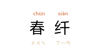 引明·刘兑《金童玉女娇红记》:「你恰是省得也么哥!也哥么!则见他露春纤行展著底头觑。」清·洪升《长生殿·第二一出》:「春纤十个擂槌,玉体浑身糙漆。」