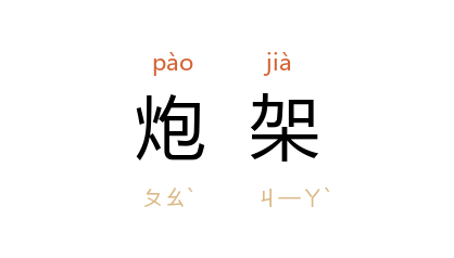引宋 陈规 《守城录》卷二:“每砲於城立一人,专照斜直远近,令砲手定放,小偏则移定砲人脚,太偏则移动砲架。”宋 石茂良 《避戎夜话》卷上:“惟砲架最难制御。”《水浒传》第一一三回:“便就船里,搬过砲笼、砲架来,都藏埋衣甲船内。”《续资治通鉴·元顺帝至正二十七年》:“时 徐达 令四十八卫将士,每卫製 襄阳 礮架五座,他礮架各五十餘座,昼夜礮声不絶。”