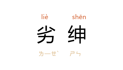 引郑观应 《盛世危言·书吏》:“下自州县,上至督抚,旁及海关,房科胥差,皆以重貲承充,与本地劣绅痞棍串通作弊,恐吓乡愚,勒索无辜,被累者竟致无门可诉。”毛泽东 《怎样分析农村阶级》:“军阀、官僚、土豪、劣绅是地主阶级的政治代表,是地主中特别凶恶者。”