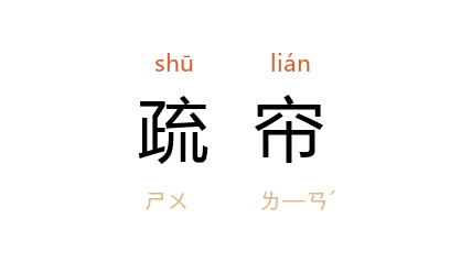 引宋 张耒 《夏日》诗之一:“落落疏帘邀月影,嘈嘈虚枕纳溪声。”清 蒋溥 《桐花歌》:“踈帘一幅 瀟湘 雨,老鶯作歌雏燕舞。”