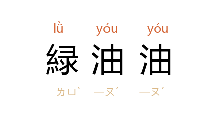 引清 黄鷟来 《雨中感怀》诗:“芳草发远郊,平原緑油油。”刘半农 《扬鞭集·晓》:“雾中隐隐约约,有几墩绿油油的矮树。”茅盾 《春蚕》一:“在他面前那条‘官河’内,水是绿油油的,来往的船也不多。”