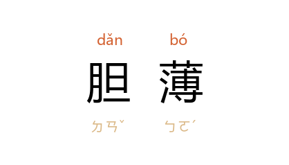 引《三国志·魏志·武帝纪》:“吾知 绍 之为人,志大而智小,色厉而胆薄。”唐 杜牧 《李甘》诗:“拜章岂艰难,胆薄多忧惧。”宋 刘克庄 《跋黄慥诗》:“余十年间,一句一字不敢出吻,非曰材尽,胆薄而气索矣。”