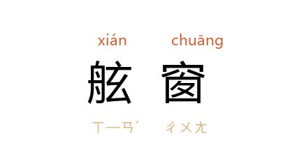 ⒈ 飞机或船只上附于舷侧的圆厚玻璃窗。