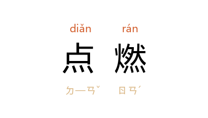 引清 潘荣陛 《帝京岁时纪胜·七月·中元》:“点燃河灯。”郭沫若 《女神·序诗》:“你去,去在我可爱的青年的兄弟姐妹胸中,把他们的心弦拨动,把他们的智光点燃吧!”杨沫 《青春之歌》第二部第二十二章:“戴愉 点燃一支纸烟。”
