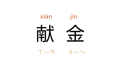 引南朝 梁 王筠 《为王仪同莹初让表》:“执玉献金,卒先五等。”郭沫若 《沸羹集·猪》:“文协会办过一次小规模的书画展,不记得是为了响应什么献金了。”