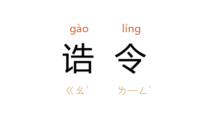 引唐 元稹 《翰林承旨学士记》:“凡大誥令,大废置,丞相之密画,内外之密奏,上之所甚注意者,莫不专对。”一本作“詔令”。 《新五代史·唐书·庄宗皇后刘氏传》:“是时,皇太后及皇后交通藩镇,太后称‘誥令’,皇后称‘教命’。”清 龚自珍 《古史钩沉论四》:“王者於是芳香其情以下之,玲瓏其誥令以求之,虚位以位之。”