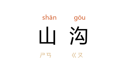 引沙汀 《丁跛公》:“他象尾巴一样跟着父亲,肩头上搭着蓝布褡裢,‘扫荡’似地在这山沟里穿梭着,整整有七年之久。”杨朔 《秘密列车》:“五峰 周围有不少山沟,两边是挺高的山,又有树,正好隐藏。”