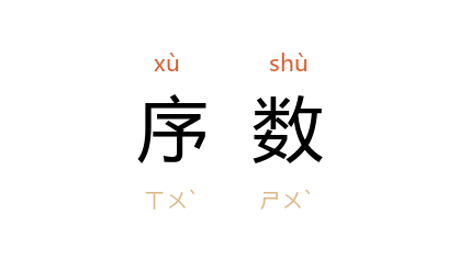 ⒈ 表示事物次第的数目。通常有三种方式:(1) 在整数前加「第」字,如第一、第二。(2) 直接于序数后接量词或名词。如二等、三楼、四号、五班。(3) 习惯表示法。如头一回、末一次、正月、大儿子、么女儿。