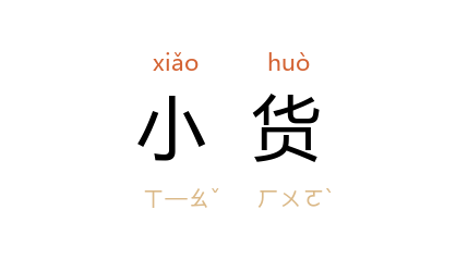 引《儒林外史》第二三回:“他做小司客的时候,极其停当,每年聚几两银子,先带小货,后来就弄窝子。”《发财秘诀》第十回:“我去年才荐他做一个洋布式拉夫,他一得了这件事,白手空拳的先就做了两票小货,居然叫他赚了一千多。”