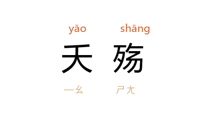 引《列子·黄帝》:“不知乐生,不知恶死,故无夭殤。”《百喻经·婆罗门杀子喻》:“今此小儿七日当死,愍其夭殤,以是哭耳。”唐 韩愈 《此日足可惜赠张籍》诗:“谁云经艰难,百口无夭殤。”沙汀 《酒后》:“他又接连搬出那两个夭殇了儿女,申言全是因为她招呼疏忽葬送掉的。”