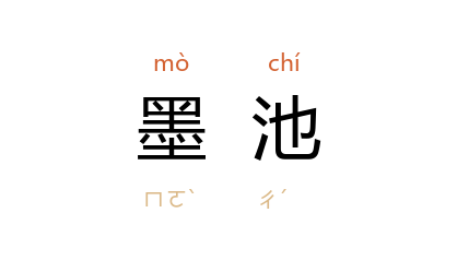 ⒈ 洗笔砚的池子。著名书法家 汉 张芝、晋 王羲之 等,均有“墨池”传说著称后世。
