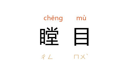 ⒈ 瞠着眼。常表示惊讶、恼怒或无奈等。