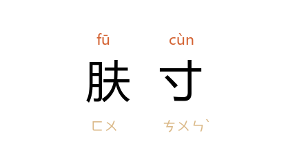 ⒈ 古代长度单位。一指宽度为寸,伸直四指的宽度为肤(一肤为四寸)。也用以比喻极小:肤寸之地。