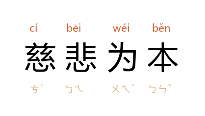 引《南齐书·卷五四·高逸传》史臣曰:「今则慈悲为本,常乐为宗,施舍惟机,低举成敬。」《西游记·第三八回》:「徒弟啊!出家人慈悲为本,方便为门。你怎的这等心硬?」