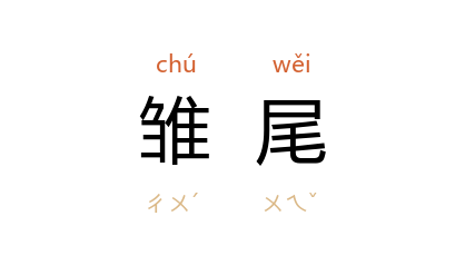 ⒈ 幼鸟或幼禽的尾巴。语出《礼记·内则》:“雏尾不盈握,弗食。”孔颖达疏:“雏,谓小鸟,尾盈一握,然后堪食,若其过小未盈握,不堪食也。”