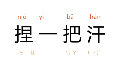 ⒈ 亦作“揑一把汗”。形容心情紧张,担心。