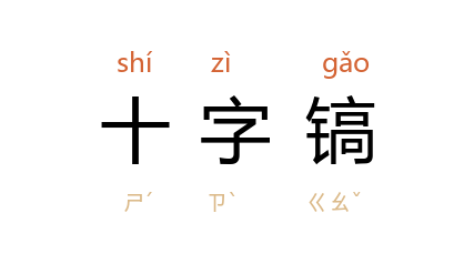 ⒈ 一种用来掘土石的铁制工具。镐头与柄呈十字形,镐头一端尖锐,一端扁平。