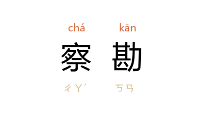 引清 王士禛 《居易录谈》卷中:“朕心深切軫念,著行该抚亲歷 直隶 被灾各州县,通加察勘,悉心筹画,应作何积贮,该抚详议具奏。”清 黄六鸿 《福惠全书·邮政·总理》:“一则草料喂养,勤行察勘。”茅盾 《送考》:“原来这位少爷已经象总司令察勘地形似的把这庞大校舍的每个角落都摸过了。”