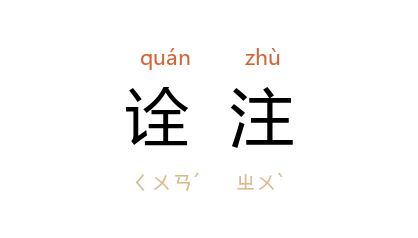 引宋 王禹偁 《谢赐御制<逍遥咏秘藏诠>表》:“念释 老 之多歧,于是詮註微言,咏謌至道。”樊增祥 《<东溪草堂词选>自序》:“其已见《词选》者不録,録其未收者,自 唐 及 元,凡一百四十二家,都四百二十九首,间加詮註,密勘丹黄。”