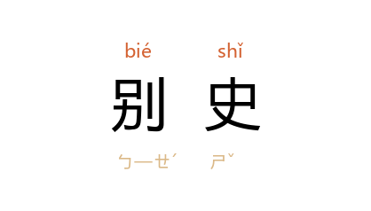 ⒈ 图书四部分类中史部的一目。指不属于正史、杂史的史书。 宋 陈振孙 《直斋书录解题》始有别史一目,收录有 唐 高峻 《高氏小史》、 宋 吕祖谦 《新唐书略》等。 明 黄虞稷 《千顷堂书目》把编年体、纪传体以外,杂记历代或一代事实的史书,称为“别史”。