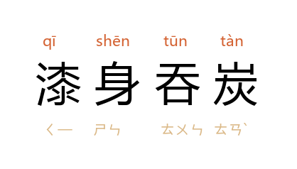 ⒈ 战国时豫让为了刺杀赵襄子替主报仇,漆身以改变容貌,吞炭将嗓子弄哑,使人不能辨认。典出也作「吞炭漆身」。