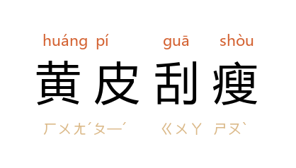 引余辰 《蚕》六:“一天过去了,蚕完全绝食啦,一个个饿得黄皮刮瘦,眼看就要死了。”亦作“黄皮寡瘦”。 熊伯涛 《宁都兵暴前后》:“一群饿得黄皮寡瘦的人,伸着两只皮包骨头的手。”
