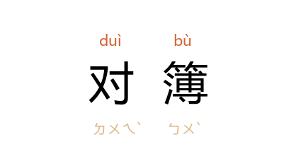 ⒈ 簿,文状,即现代的起诉书。对簿指依据文状加以审问,期能经由勘察而符于事实。后乃将狱讼受审称为「对簿」。