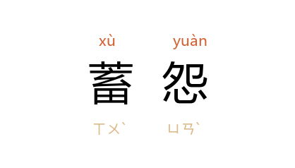 引《国语·楚语下》:“积货滋多,蓄怨滋厚,不亡何待。”《楚辞·九辩》:“蓄怨兮积思,心烦憺兮忘食事。”王逸 注:“结恨在心,虑愤鬱也。”金 王若虚 《<新唐书>辨中》:“文士难犯,虽修睦乎外,而蓄怨於内。”清 昭槤 《啸亭杂录·尹文端公》:“不侵官,不矫俗,不蓄怨。”