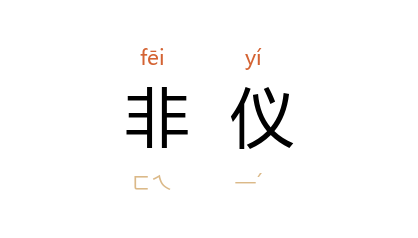 后以“非仪”指妇女的是与非,善与恶。 《孔子家语·本命》:“﹝女子﹞教令不出於闺门,事在供酒食而已,无閫外之非仪也。”