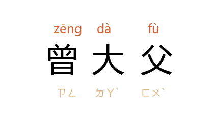 引《史记·夏本纪》:“禹 之曾大父 昌意 及父 鯀 皆不得在帝位,为人臣。”唐 韩愈 《崔评事墓铭》:“曾大父 知道,仕至大理司直。大父 玄同,为刑部侍郎。”宋 陆游 《东阳陈君义庄记》:“曾大父之曾孙为从祖兄弟。”清 戴名世 《响雪亭记》:“余曾大父隐於 龙眠山 中。”