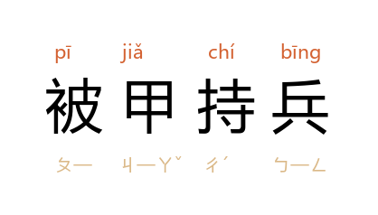 引汉 荀悦 《汉纪·文帝纪上》:“勃 在国,常恐惧,每郡守使丞尉行县, 勃 常被甲持兵。”宋 苏轼 《乞增修弓箭社条约状》之一:“骄惰既久,胆力耗惫,虽近戍短使,輒与妻拏泣别,被甲持兵,行数十里,即便喘汗。”唐 韩愈 《画记》:“杂古今人物小画共一卷,骑而立者五人,骑而被甲载兵立者十人。”