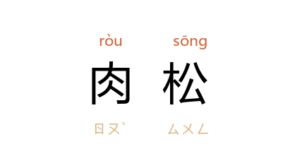 ⒈ 用肉类焙干制成的屑状食品。大陆地区亦将丝绒状的肉脯含括其中。也作「肉松」。